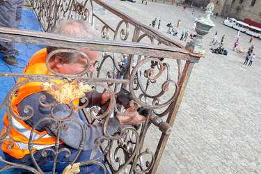 Intervención: operaciones de mantenimiento en las barandas, consistentes en la realización de pequeñas reparaciones y el pintado del dorado de las hojas ornamentales.